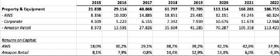 按部门划分的财产和设备以及资本回报率(亚马逊10-K报告)