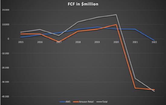 AWS FCF与合并FCF的区别在于亚马逊零售FCF。为了看得更清楚,下面是一张结果图表:
