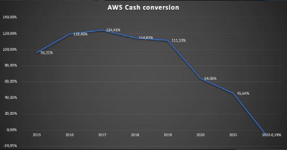 分析师认为,如果AWS想在未来几年保持高增长率,就必须像过去三年那样保持高资本支出。现金转换率100%以上的时代已经一去不复返了。