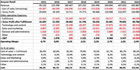 2015-2022年亚马逊零售损益表估算值(作者根据已披露的细分市场信息估算)