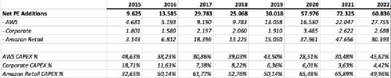 过去,AWS在物业和设备净增量中所占的份额一直在30-50%左右。由于物流网络的建设,2020年和2021年零售部门的净增长份额非常高。