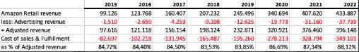 不包括广告收入,亚马逊零售核心毛利率(不包括广告收入的收入-销售成本-履行成本)从2015年的15%左右下降到2022年的12%。
