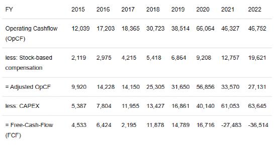 请注意,这里是将基于股票的薪酬(SBC)视为现金费用,因为它应该属于“来自融资活动的现金”。可以看到,在综合基础上,亚马逊的FCF一直为正,直到2020年。2021年和2022年的FCF严重为负。