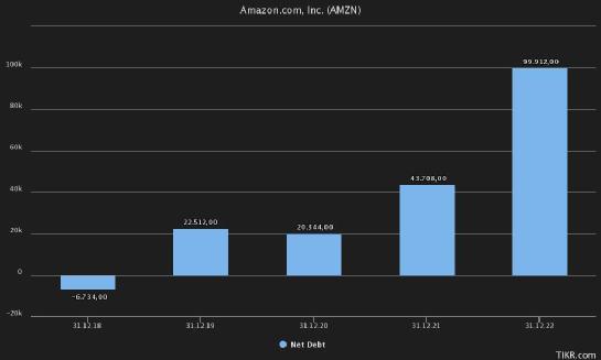 亚马逊2018-2022年净负债(Tikr终端)
