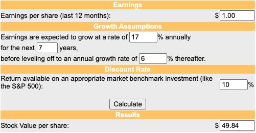 假设CAGR在中点,也就是17%直到2029年。分析师将把永久增长率定为6%,就像他通常对那些产生持续高资本回报的公司所做的那样。在这种情况下,需要将1美元的AWS FCF估值为49.84美元,如下图所示: