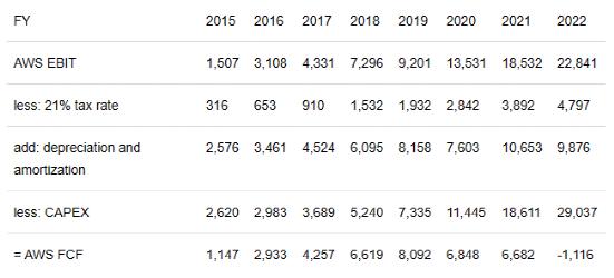 由于亚马逊还报告每个部门的折旧和摊销,可以进行自下而上的计算来估计AWS的FCF。估计AWS的资本支出百分比与上表中财产和设备净增加的百分比相同。以下是数字(以百万美元为单位):