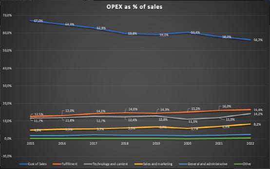 为了了解亚马逊零售业务的盈利能力,需要仔细研究一下运营费用的来源。下图显示了综合水平上成本占销售额的百分比: