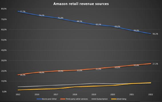 这就是有趣的地方,也是看好亚马逊的主要理由所在。在线和实体店的销售额占比正在下降,而第三方卖家服务、优质订阅收入和广告收入占总收入的比例正在稳步上升。