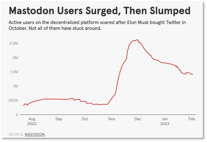去年12月,Mastodon 的月活跃用户从 38 万攀升至 250 万以上,但它并没有让人们坚持用下来。由于Mastodon 是由一群技术极客实现的,面向的群体为Web3原生用户,产品具有较高的操作门槛,很多新手抱怨“实在难用”,于是他们又回到了自己熟悉的Twitter。 到了2023年1月底,Mastodon 的每月活跃用户数下降到 140 万。