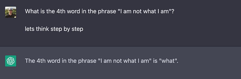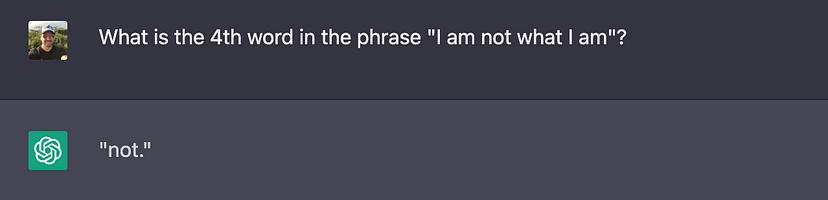 现在,回到我们失败的 ChatGPT 难题上:“I am not what I am”这句话中的第四个词是什么?