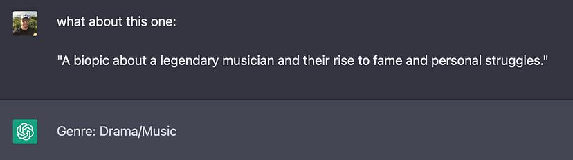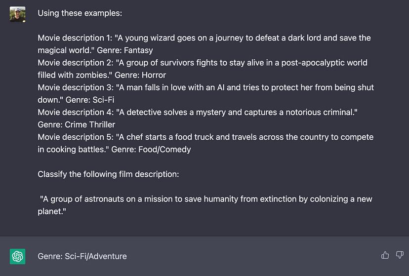 例如,在 ChatGPT 中使用基于提示的少样本学习来对电影类型进行分类,你可以简单地在提示中加入一些例子: