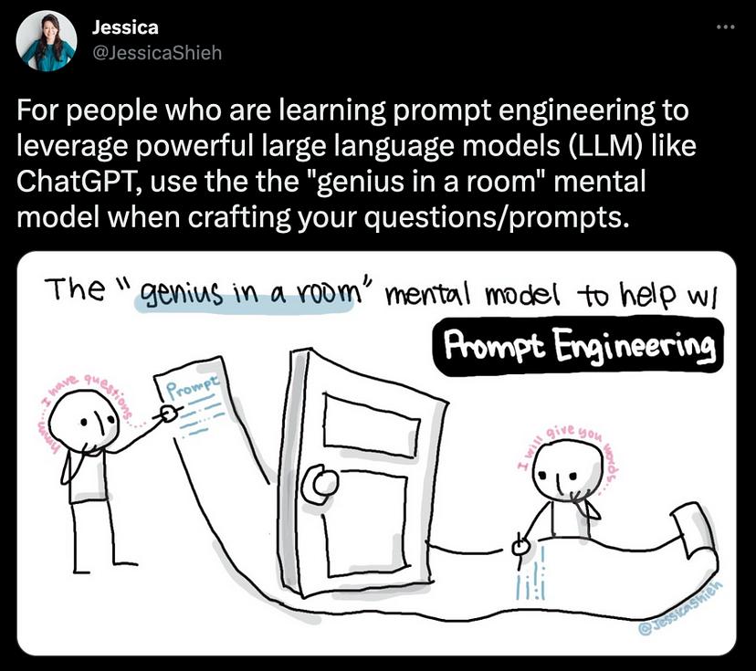 OpenAI 的人工智能战略家 Jessica Shieh 在学习提示工程时推荐了一种方法,称为“房间里的天才”心理模型。