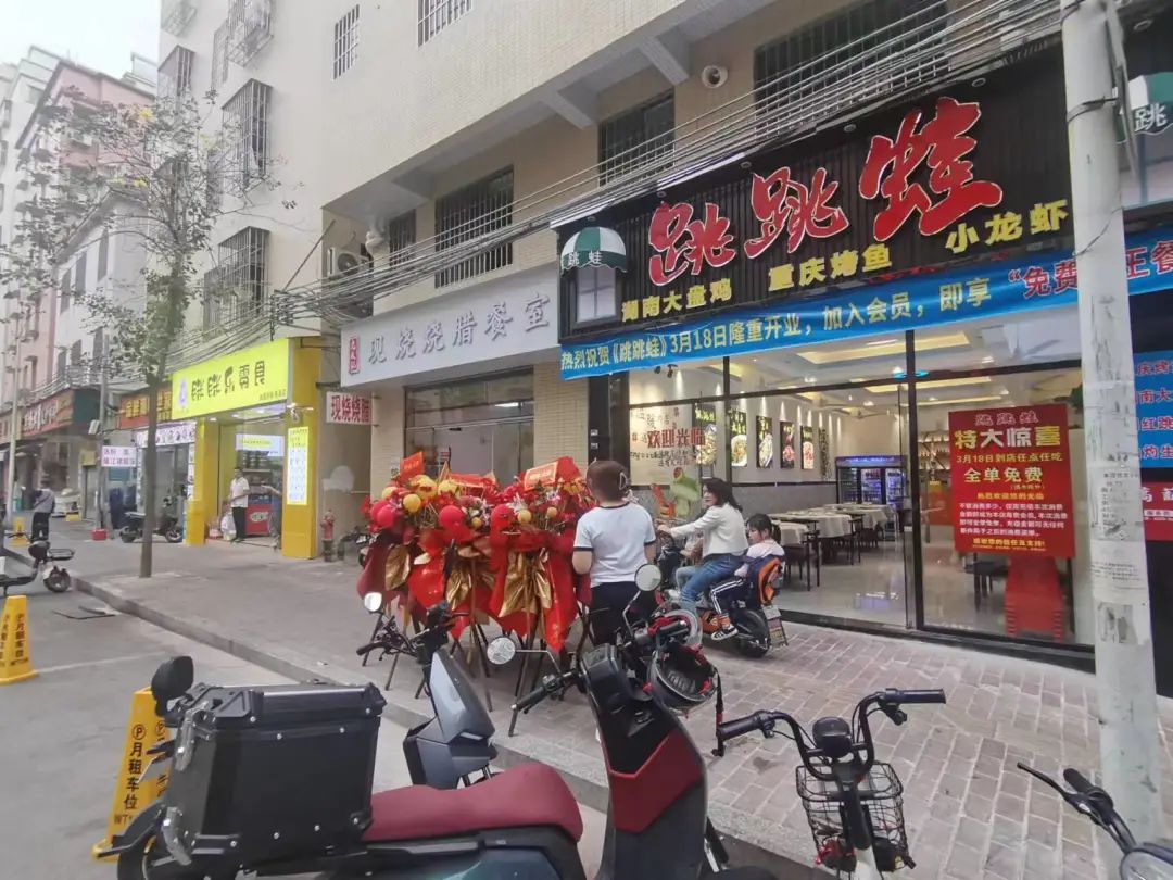 数了下,一共新开7间,都是餐饮店,花篮堆满门口,老板喜笑颜开。