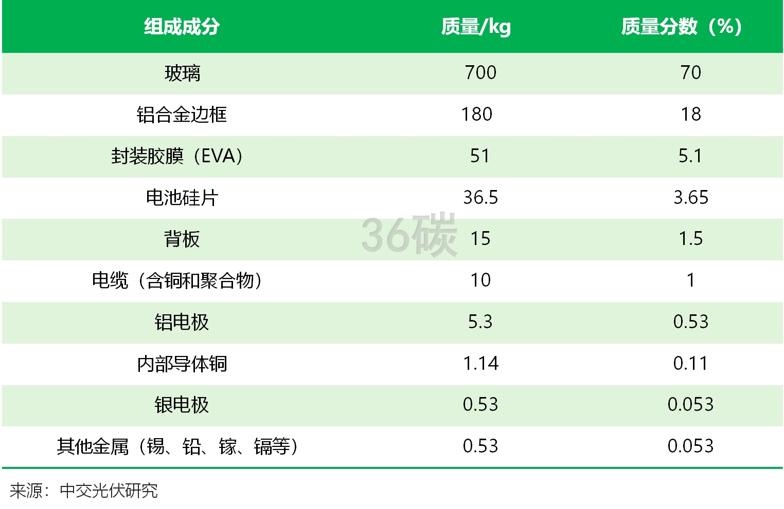 公开资料显示,目前市场最主流的晶硅光伏组件(占总装机量的85%-90%)当中,玻璃约占总重的70%,铝边框约占18%,太阳能电池约占4%,铅、银、镓等金属约占1%。
