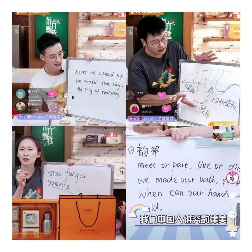 在当时,从讲解英文单词、双语带货到才艺表演,再到地理、历史、物理、哲学等知识科普,甚至出口成章的小作文,东方甄选的主播们在直播间里尽情展现才艺。社交媒体上,“跟着董宇辉学文案”“跟着YoYo(顿顿)学英文”等成为热门话题,双语直播的英语笔记在粉丝中流传。