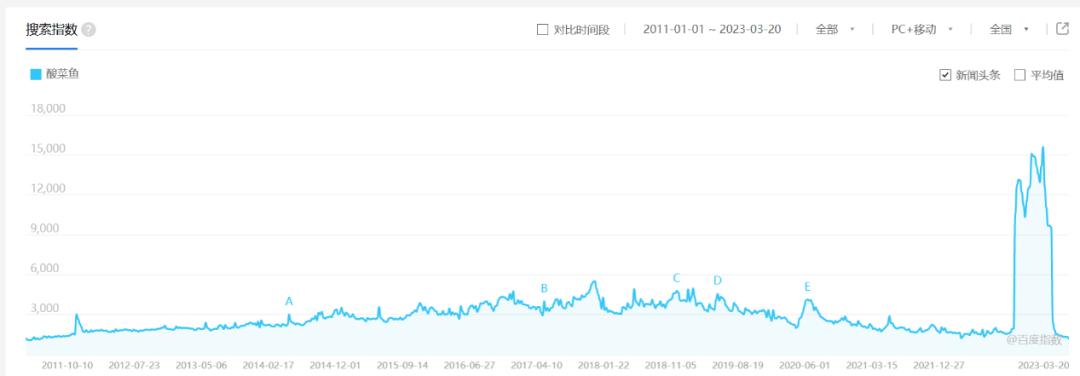 去年8月,酸菜鱼搜索指数一度爆涨了十多倍,热度维持到了当年年底。