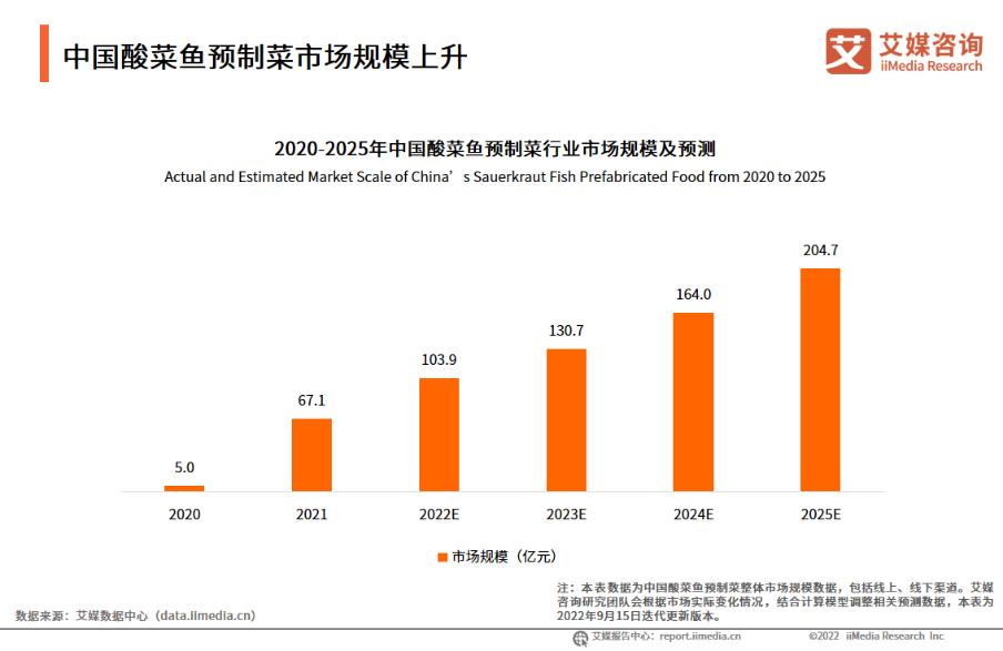 艾媒数据显示,2021年中国酸菜鱼预制菜市场规模达67.1亿元,预计2025年将增到204.7亿元。/ 图 源 : 艾媒 咨询