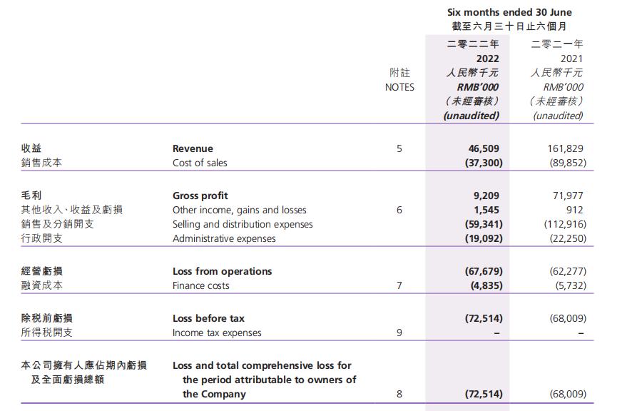 2022年上半年,克莉丝汀实现收入约4650.9万元,较2021年同期的16182.9万元减少约71.3%;毛利则从7197.7万元减少到2022年上半年的920.9万元,同比减少约87.2%。
