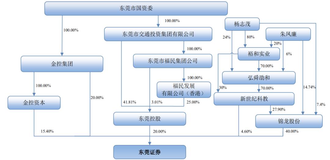 招股书显示,锦龙股份为东莞证券第一大股东,持股40%,但东莞市国资委通过东莞金控资本投资有限公司、东莞发展控股股份有限公司(000828.SZ)、东莞金融控股集团有限公司间接控制东莞证券55.4%的股份,为东莞证券实控人。