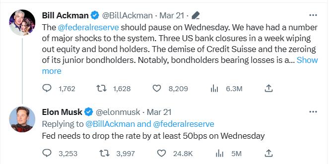 就在两天前,马斯克在推特上回复潘兴广场资本管理公司创始人比尔·阿克曼,“建议美联储将利率至少下调50个基点”。