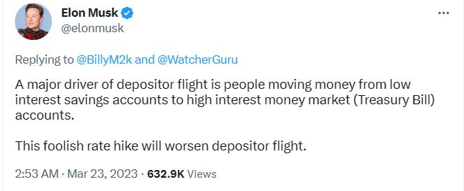 马斯克在推特上写道,“储户外逃的主要驱动因素是,人们将资金从低息的储蓄账户转移到高息的货币市场(国库券)账户。”
