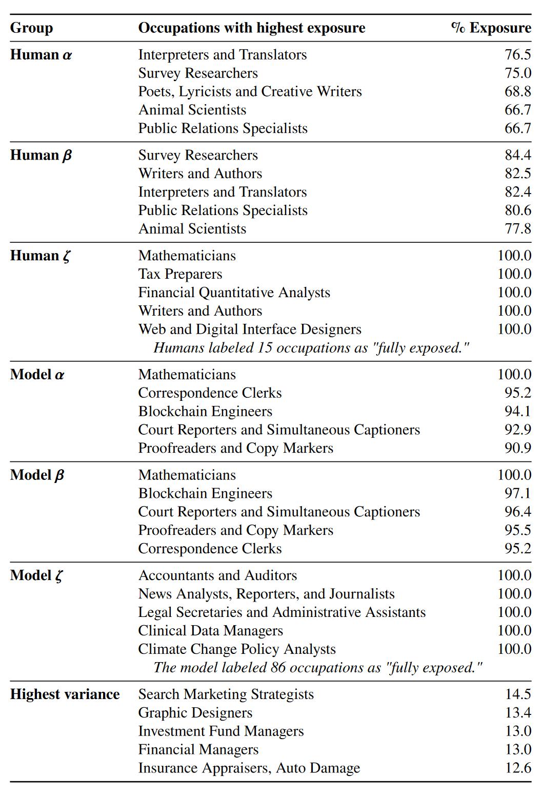 然后,OpenAI 让人类和 GPT-4 来评估:如果一项工序在质量不变的情况下,使用 AI 能够减少其 50% 以上的时间,那么它就是可替代的 —— OpenAI 的原话叫做「暴露于 AI」。如果一项工作的多数工序都暴露于 AI,那么这项工作就是暴露于 AI 的。