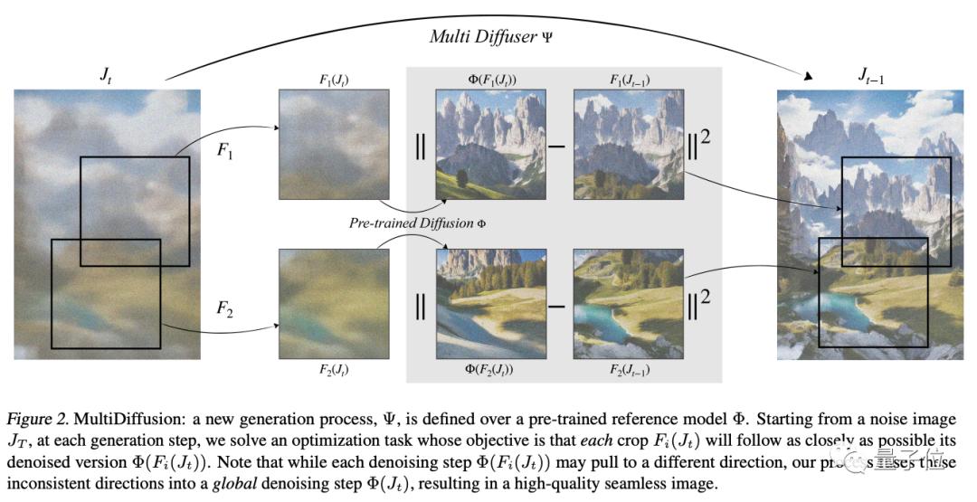 简单来说,MultiDiffusion的关键在于,在预先训练好的扩散模型上定义一个全新的生成过程。从噪声图像开始,在每个生成步骤中,解决一个优化任务。