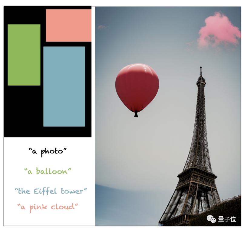 蓝色部分是埃菲尔铁塔、红色是粉色的云、绿色是热气球 。