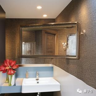 比如在黑色部分是一个明亮的盥洗室,红色区域是一面镜子、蓝色部分是花瓶、黄色部分是白色的水槽。