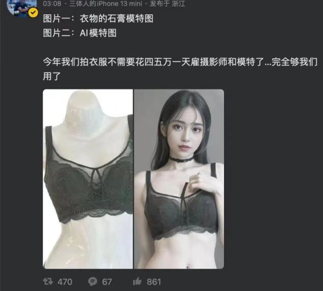 最近,有人在网上发帖,对比AI模特与石膏模特、真人模特的区别,从生成效果来看,AI模特已非常接近真人。