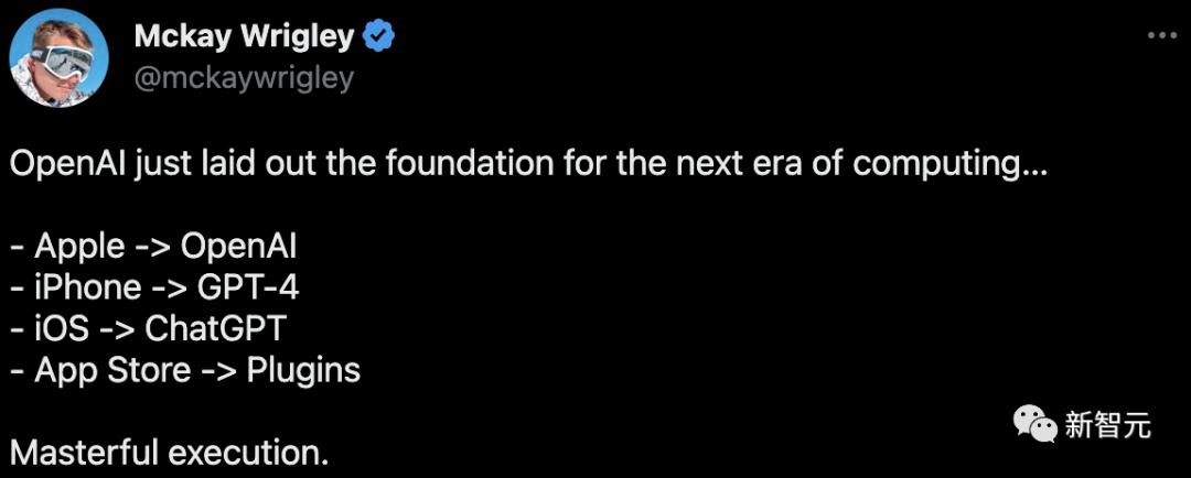 「如果把OpenAI比作苹果,那GPT-4就是iPhone,ChatGPT则是iOS,而这次发布的Plugins就是App Store了。」