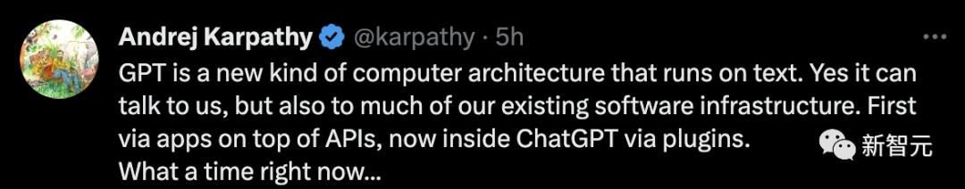 GPT类模型是一种运行在文本上的新型计算机架构,它不仅可以与我们人类交谈,也可以与现有的软件基础设施「交谈」,API是第一步,插件是第二步。