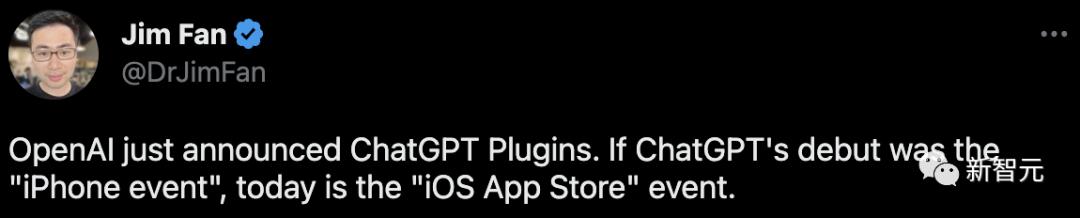 李飞飞高徒、英伟达AI科学家Jim Fan激动地说,如果说曾经ChatGPT的横空出世可以看作「iPhone的出现」,今天第三方插件的集成,就是「iOS App Store」级别的事件。