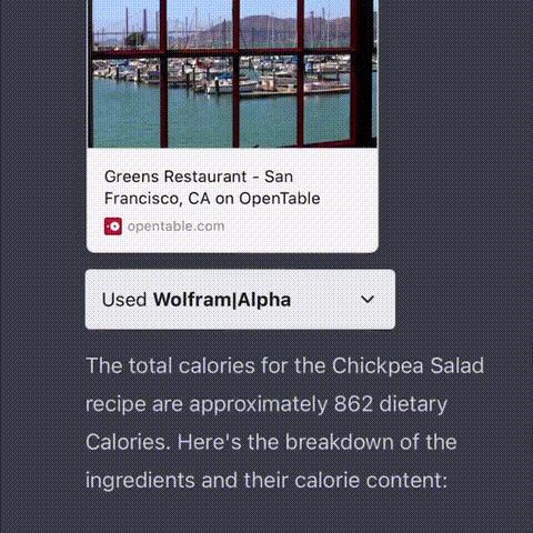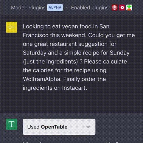 比如,「我正在旧金山,这个周末想吃素食,能不能建议下,我周六去哪家参观,周日按什么食谱做菜?请用WolframAlpha计算出食谱的热量,最后在Instacart上订购食材。」