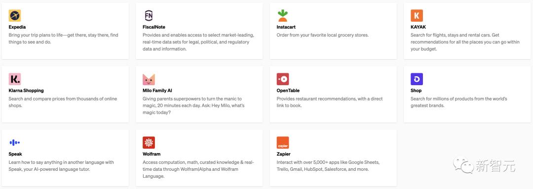 其中,第一批插件由Expedia、FiscalNote、Instacart、KAYAK、Klarna、Milo、OpenTable、Shopify、Slack、Speak、Wolfram和Zapier创建。