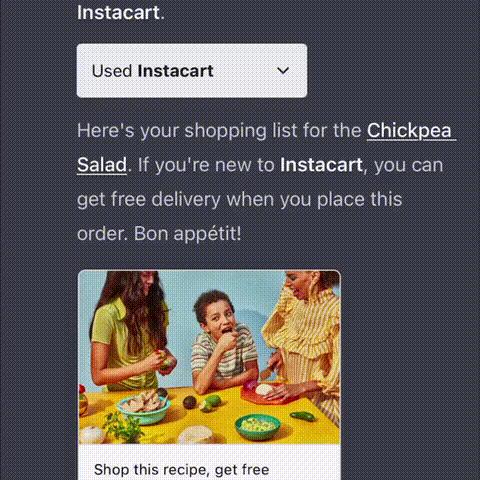 食谱出来后,它立马贴心地帮你在购物网站Instacart上下单,需要什么食材,ChatGPT已经帮你选好了。你需要做的,就是付个账。