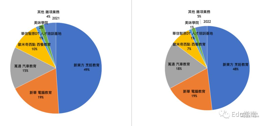 中国东方教育收入来自七分部业务,包括新东方烹饪教育、新华电脑教育、万通汽车教育、欧米奇西点西餐教育、华信智原DT人才培训基地、美味学院、其他。