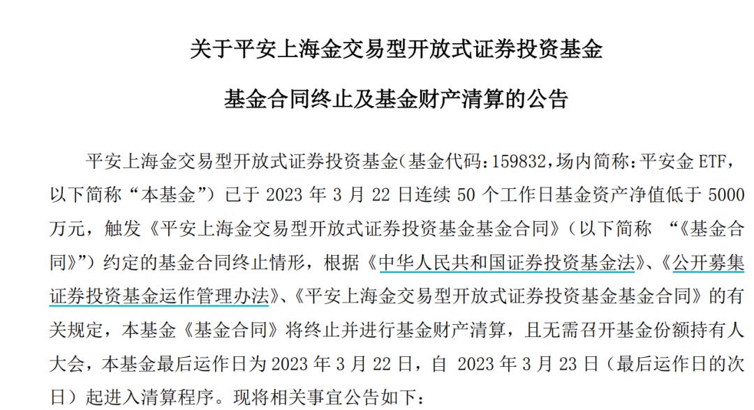 3月23日晚间,平安基金发布公告称,公司旗下平安上海金ETF于2023年3月22日,已经连续50个工作日基金净资产低于5000万元,触及了基金清盘红线,无需召开基金份额持有人大会,基金于3月23日开始终止运作并清算。