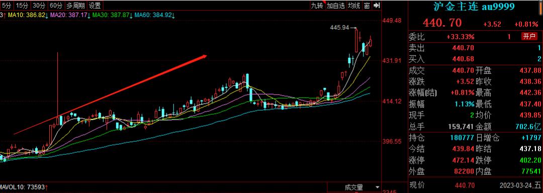 近期以来投资市场最火热的莫过于黄金。自2022年11月以来,黄金价开启一轮猛涨行情。黄金期货沪金主连(au9999)从2022年11月初的391元一路涨至2023年3月20日最高445.94元,累计涨幅达14%。