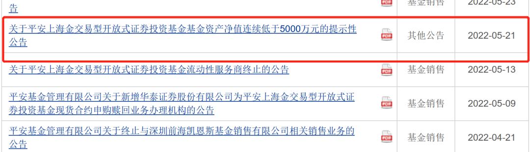 早在2022年5月,平安上海金ETF成立仅2个多月的时候,该基金就曾发布公告表示,净资产已经连续出现低于5000万元的情况。可见,在该基金成立很短的时间,就有投资者赎回基金份额。