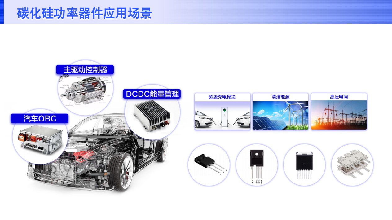 目前碳化硅主要应用于汽车、清洁能源、工业、交通运输、通信等领域,主要产品形式有新能源车电机驱动系统,车载充电系统、DC/DC变换器、非车载充电装置;光伏逆变器;输电换流阀,电力电子变压器;以及牵引变流器等。碳化硅MOSFET器件可以支持新能源汽车更高的用电效率与更精简与低成本的用电解决方案;达到更高的续航里程,实现更快的充电速度,并且进一步降低车身重量,实现更明显的效率优势。然而由于其研究技术要求和生产成本均较高,目前在市场上的占有率仍处于较低水平。