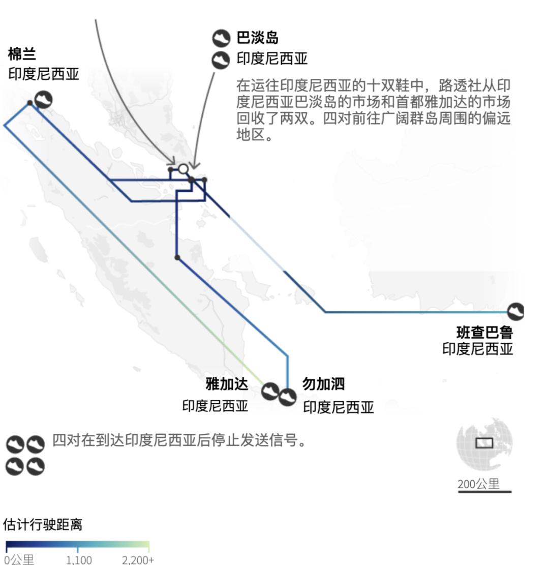 另一双鞋“跑”得更远。这双鞋在新加坡被投进回收箱,一周后,它在巴淡岛的市场上短暂停留。十几天后,这双鞋来到了附近的民丹岛上。
