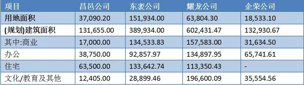 昌邑公司、东袤公司、耀龙公司项目土地主要用途为商业、办公和住宅等综合用途;企荣公司土地主要用途为商业和办公。