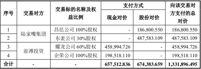 根据公告,陆家嘴本次交易方案包括发行股份及支付现金购买资产和募集配套资金两部分,拟以发行股份方式购买控股股东陆家嘴集团持有的昌邑公司100%股权、东袤公司30%股权,拟以支付现金方式购买前滩投资持有的耀龙公司60%股权、企荣公司100%股权。