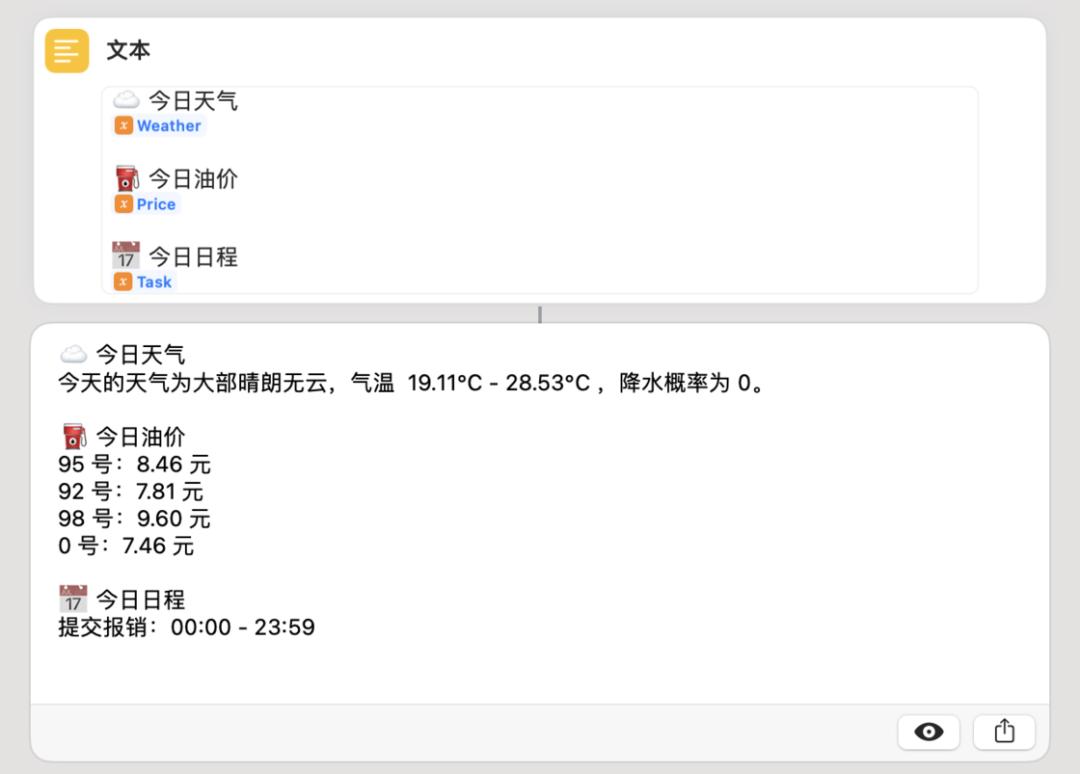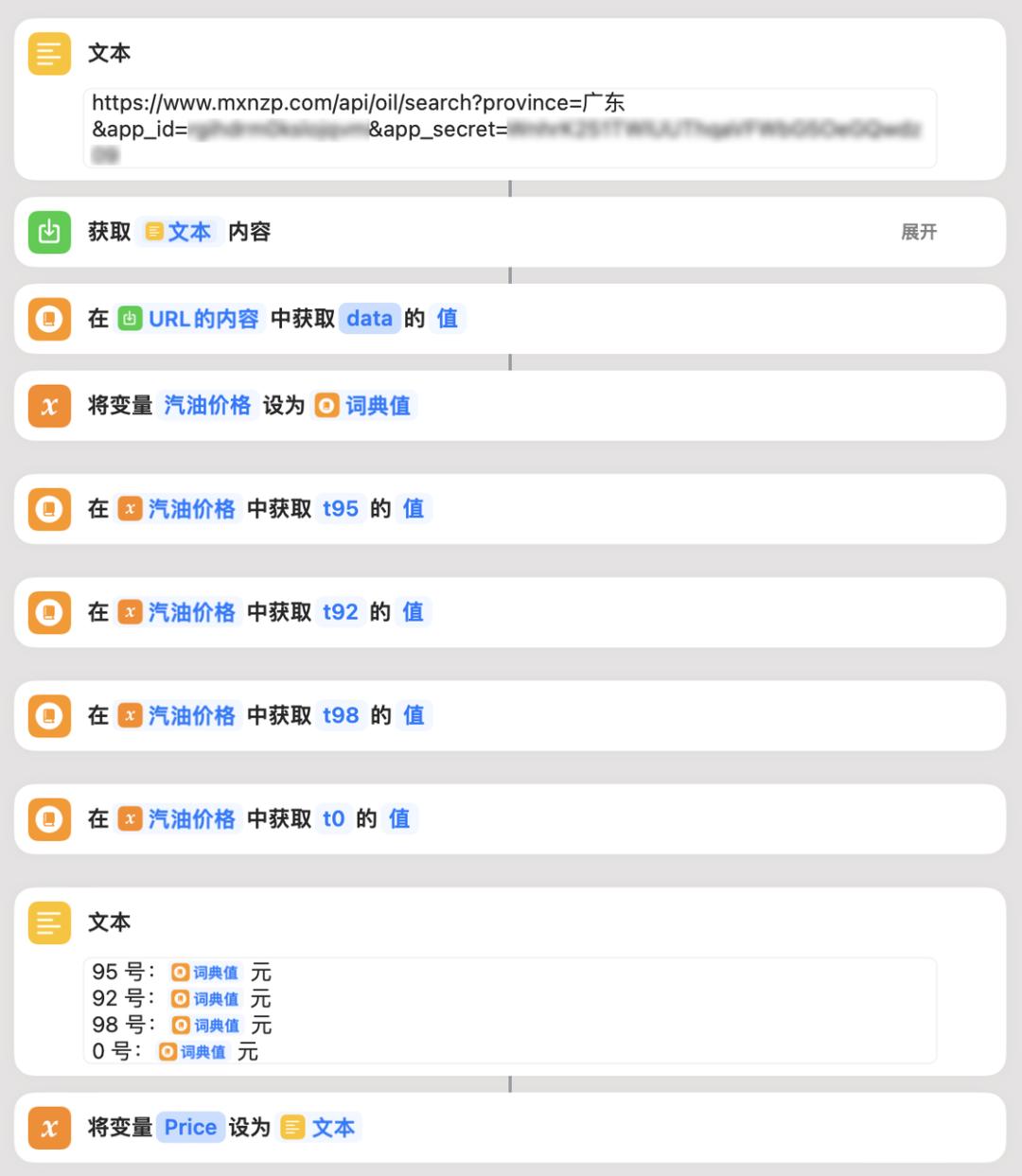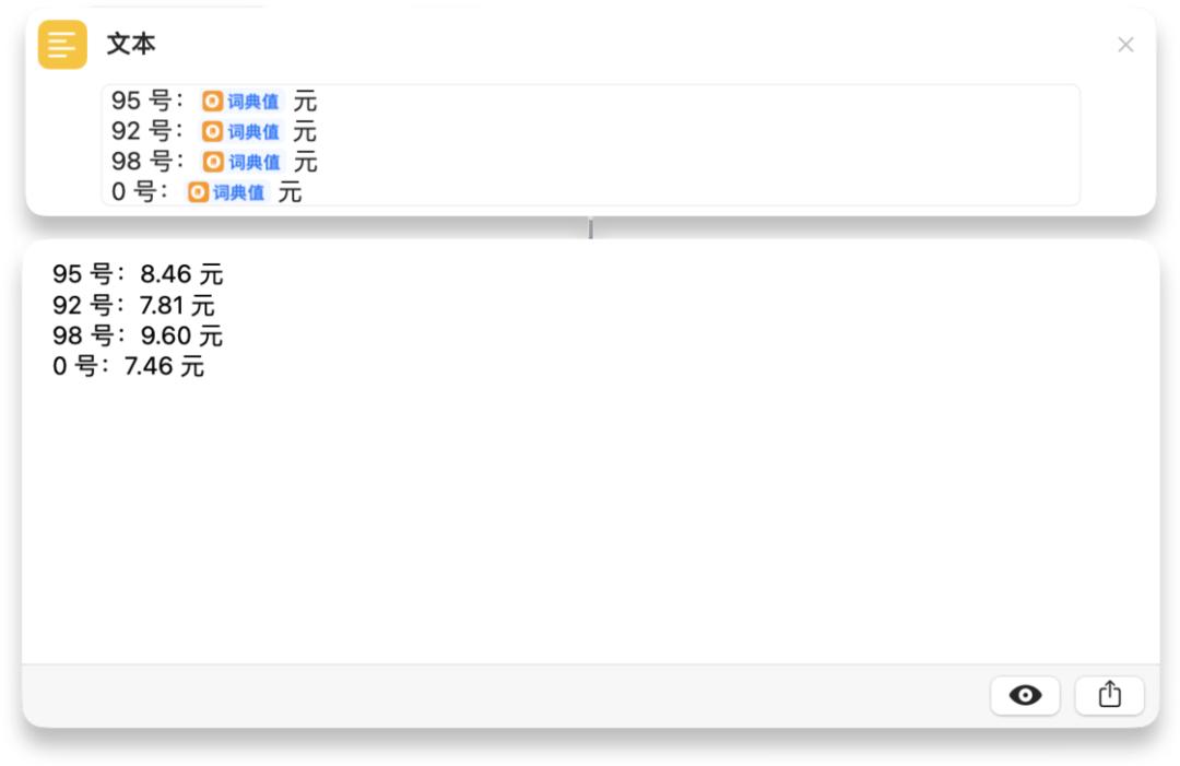 我们只需要按照自己的需求,用多个「获取词典内容」动作来筛选自己想要了解的价格,再像前文天气模块那样,用「文本」动作来把数据整理为「人话」,油价查询的模块就完成了。