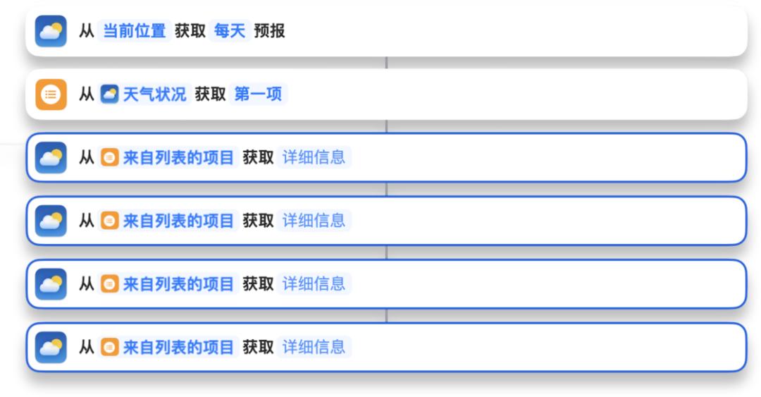 首先,我们如下图这样添加 4 个「获取天气状况的详细信息」动作: