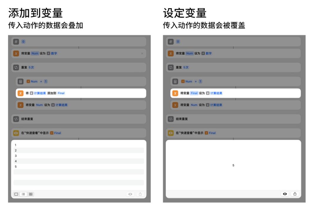 接下来是这部分动作的重点:用「添加到变量」动作存储文本。这里之所以不用「设定变量」,是因为「添加到变量」是在同一个变量里不断叠加内容,而「设定变量」则是将一个变量抹掉再写入新的内容。