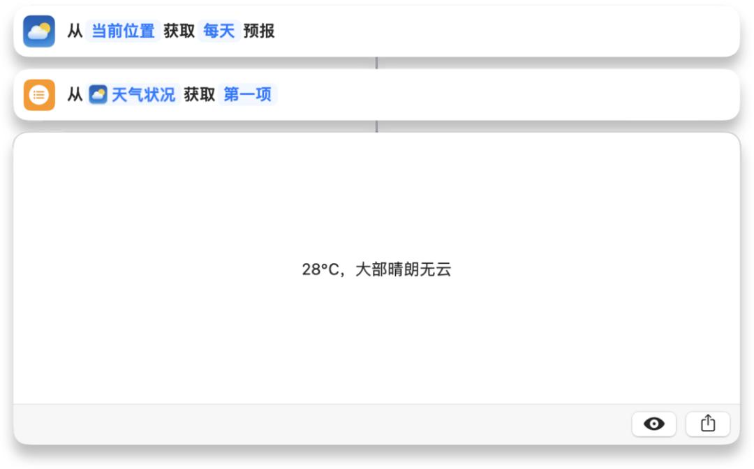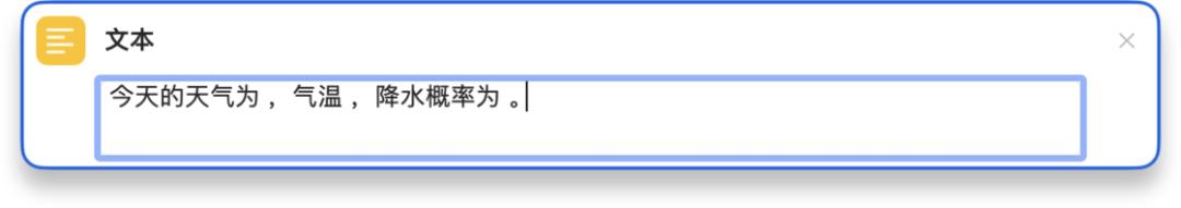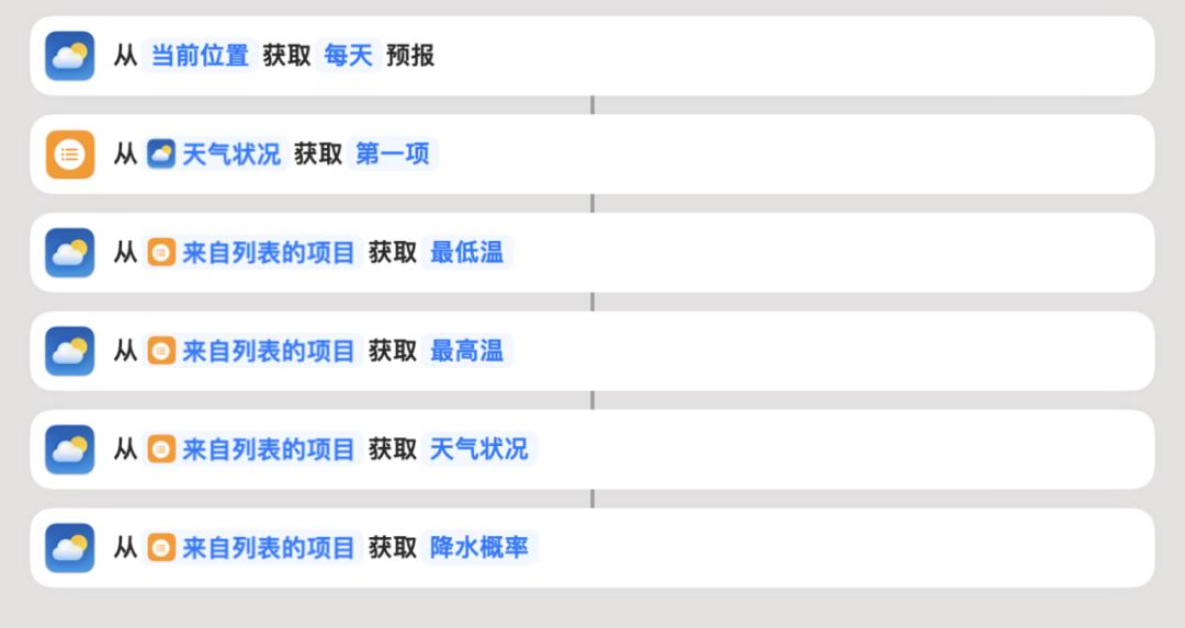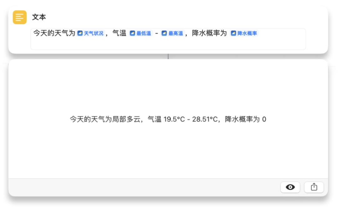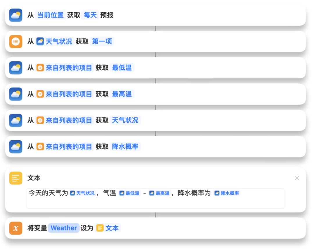 而我们需要使用文字将它们串起来,也就是:让快捷指令说人话,最后输出为「今天的天气为 X,气温 xx-xx,降水概率为 XX」。