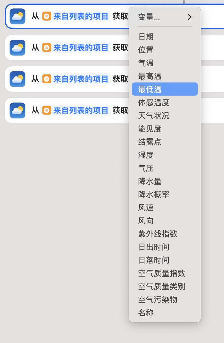 在这个例子中,我们需要获取「最低温」「最高温」「天气状况」和「降水概率」这 4 个项目。因此,我们需要逐个点击「详细信息」并选择对应的项目: