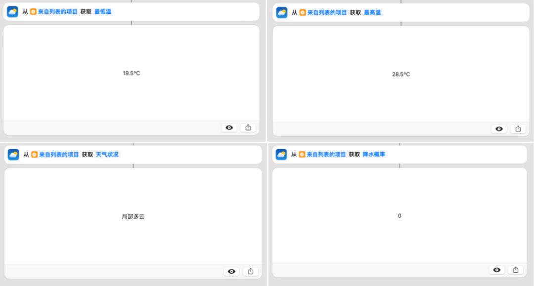 在整合内容之前,我们需要先知道快捷指令为我们准备了哪些内容。如果我们单独将每个「获取天气状况的详细信息」的内容拆开来看,会发现它们只会展现这样的数据: